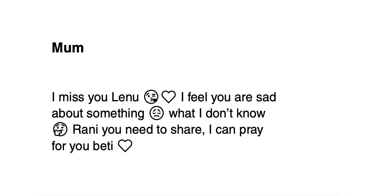 We never see Lena meet up with her parents IRL. She only interacts with them through email or Whatsapp. You can tell from her mumʼs emoji-filled messages that Lena is close to her but it seems like Lena has to guard her boundaries too: