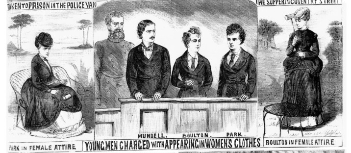 One of the most notorious yet historically significant scandals of Victorian England was the curious case of two young men in their early twenties: Frederick Park, a law student and Ernest Boulton, or Fanny and Stella (their female names). On the night of 28 April 1870, Park and Boulton were arrested outside the Strand Theatre for outraging public decency. Both were dressed in extravagant women’s clothing: Fanny wore a ‘dark-green satin crinoline trimmed’ gown; Stella, by contrast was dressed in a ‘scarlet silk evening dress’ trimmed in ‘white lace and draped with a white muslin shawl’. Boulton and Park were frequent visitors at theatres and several public events including the Oxford and Cambridge boat race and Burlington Arcade. The police had been closely monitoring the pair’s activities since 1869. They had been known to repeatedly wear make-up while dressed in men’s clothing, and were seen flirting and winking at gentlemen on the streets and at public gatherings.